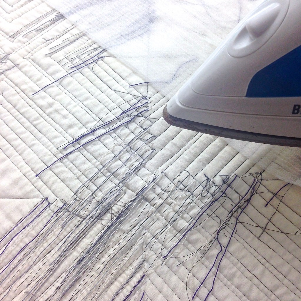 I pull the threads to the back and lightly comb them with a soft brush before I fuse a thin stabiliser onto the entire back of the quilt – to trap the threads.