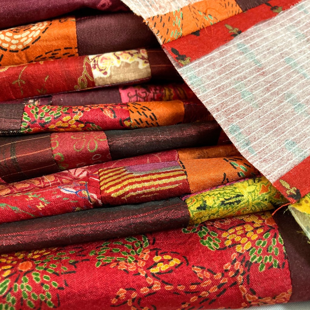 When I work with slippery silk fabrics, I fuse a light stabiliser to the back of the strips – to make stitching easier.