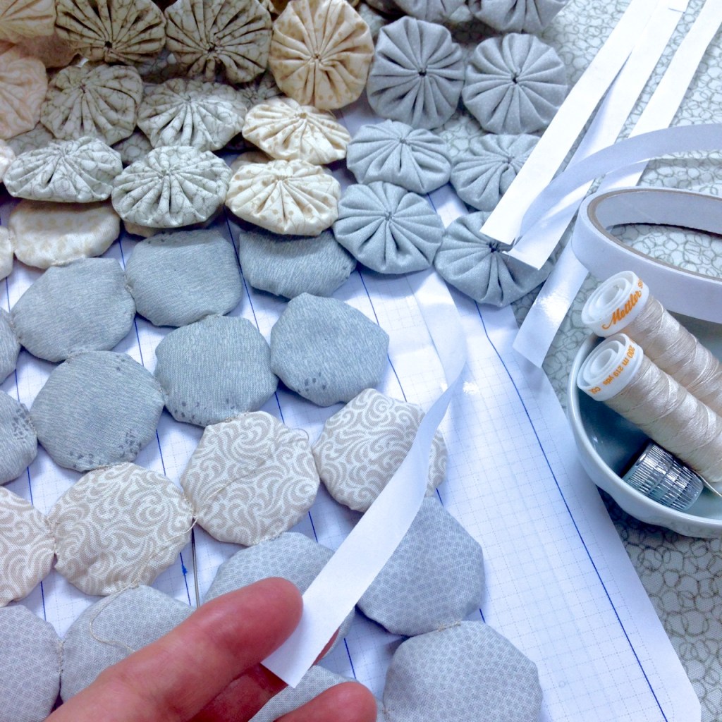 I use graph paper and double sided tape when I join Yo-yos or Suffolk Puffs – to make sure that I get the first few rows straight.