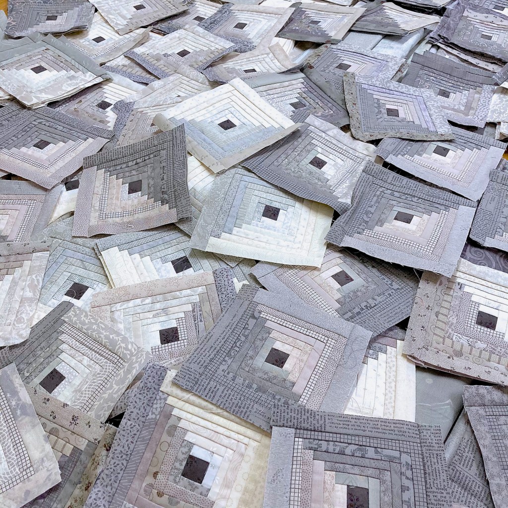 When I make log cabin blocks, I cut the strips of fabric along the lengthwise grain – parallel to the selvege. It has less stretch and prevents wonky logs.