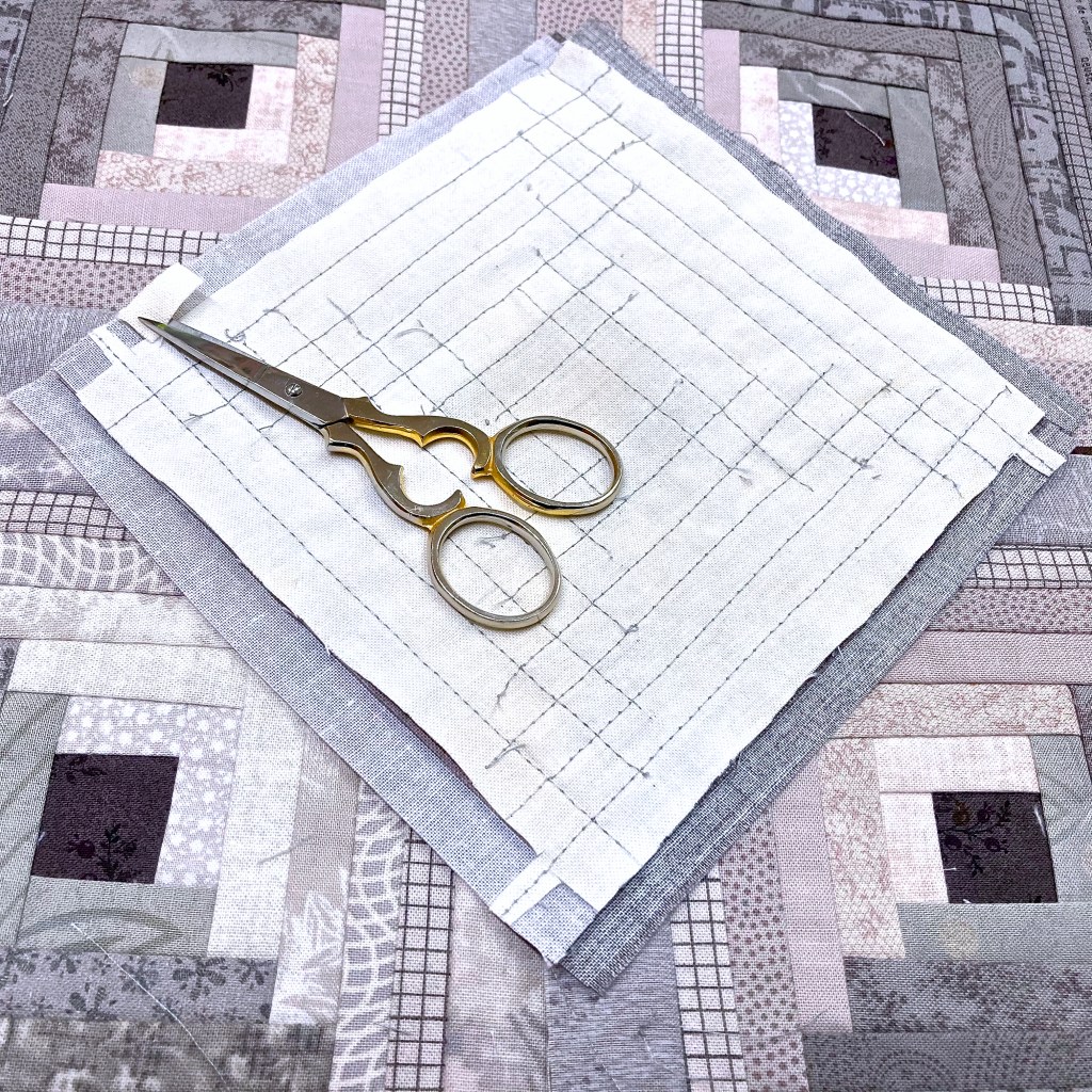 I like to fuse the centre square of a log cabin block to a base fabric square – to prevent distortion when I start to stitch the strips.