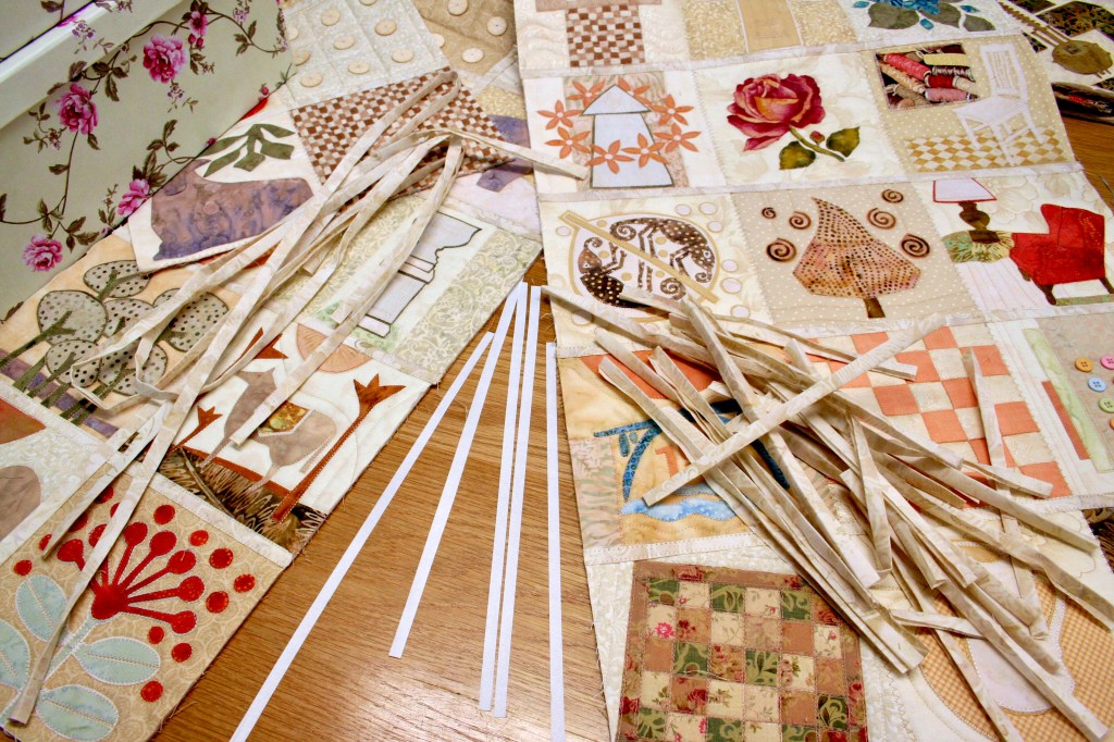 I like to join individual collage blocks with sashing strips – after I have zig-zagged the blocks together.